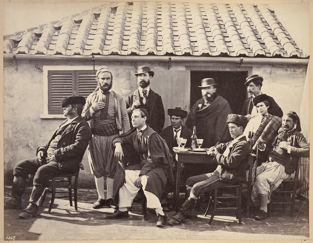 A group of men in front of a house possibly in Gibraltar, on the Iberian Peninsular. Photograph by Francis Frith, circa 1870.