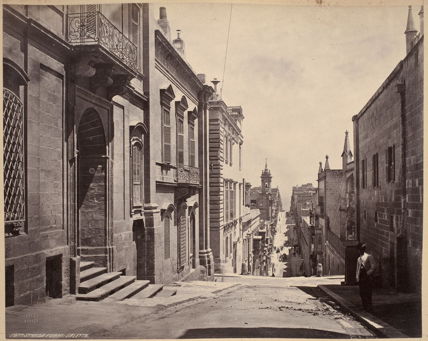 View of the Strada Forni, Valetta, Malta. The image has been taken from the top of a hill. A man wearing a white jacket apperas on the footpath to the right. Photograph by Francis Frith, circa 1870.