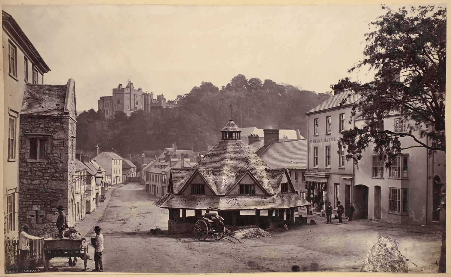 Photograph of a rotunda in the main street of Dunster, England with a Castle in the distance. The rutunder was previoulsy used to house a local yarn market. Three men can be seen on the left standing around a horse and cart whilst another three men are standing to the right in front of a building called 'GENERAL WAREHOUSE'. Photograph taken by Francis Frith, circa 1870.