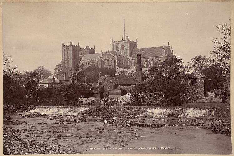 Written inside the front cover of album: 'W.W.Scott/ c/o Horticultural Press/ 78A Victoria Street/ Melbourne C1/ Box 1944/ Phone F2656/ [illegible]; Sold by G.W.Harris, Donolly Victoria.' Printed on photograph at bottom edge: 'RIPON CATHEDRAL FROM THE RIVER. 2549, J,V.'