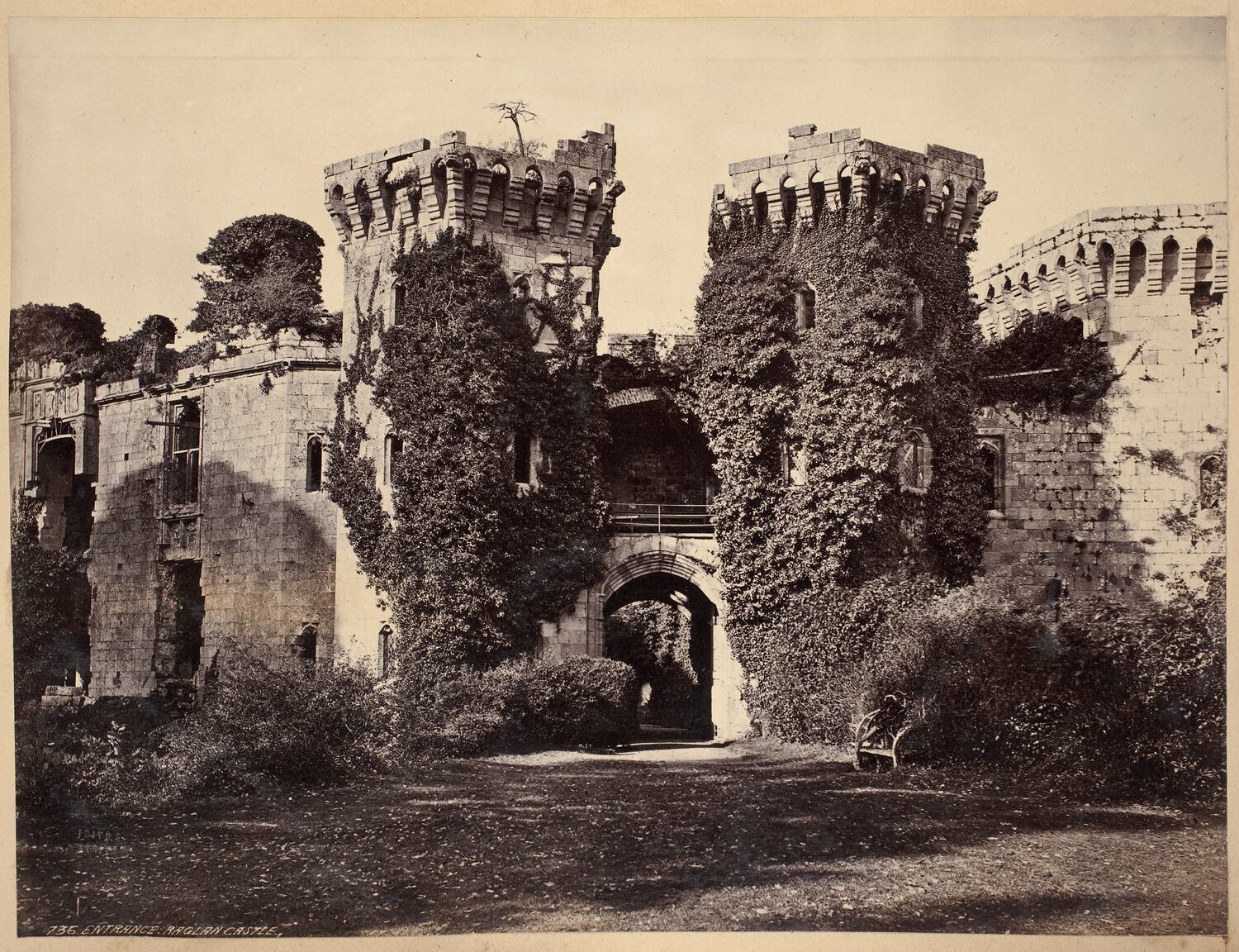 Photograph of the entrance to Raglan Castle covered in vines. Photograph taken by Francis Frith, circa 1870.