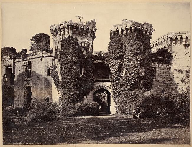 Written inside the front cover of album: 'W.W.Scott/ c/o Horticultural Press/ 78A Victoria Street/ Melbourne C1/ Box 1944/ Phone F2656/ [illegible]; Sold by G.W.Harris, Donolly Victoria.' Embossed on photograph at left bottom corner: 'FRITH'S SERIES' Printed on photograph at bottom edge: 735 ENTRANCE RAGLAN CASTLE