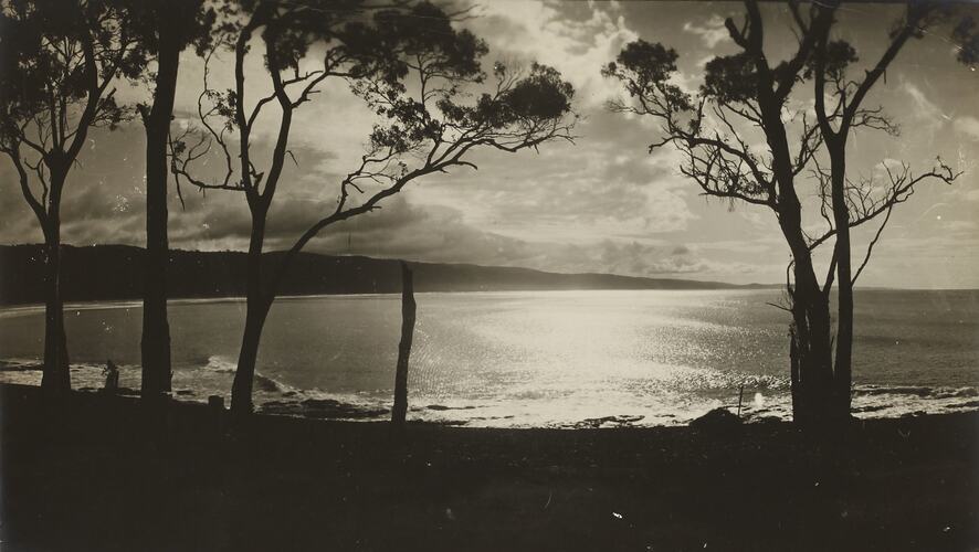 Monochrome photograph looking across Loutit Bay, Lorne. It is part of a collection of glass plate negatives, stereoscopic negatives, panoramas, postcards, photographs and cameras belonging to the William S Anderson Collection.