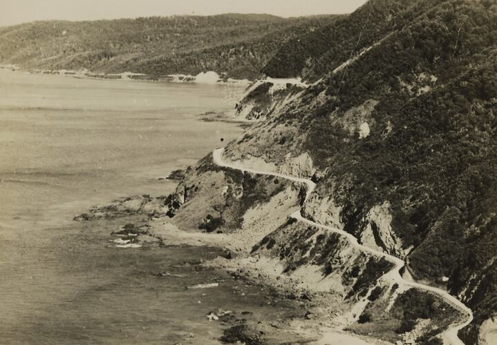 Black and white image of the Great Ocean Road winding around Mt Defiance, near Lorne, Victoria. It is part of a collection of glass plate negatives, stereoscopic negatives, panoramas, postcards, photographs and cameras belonging to the William S Anderson Collection.