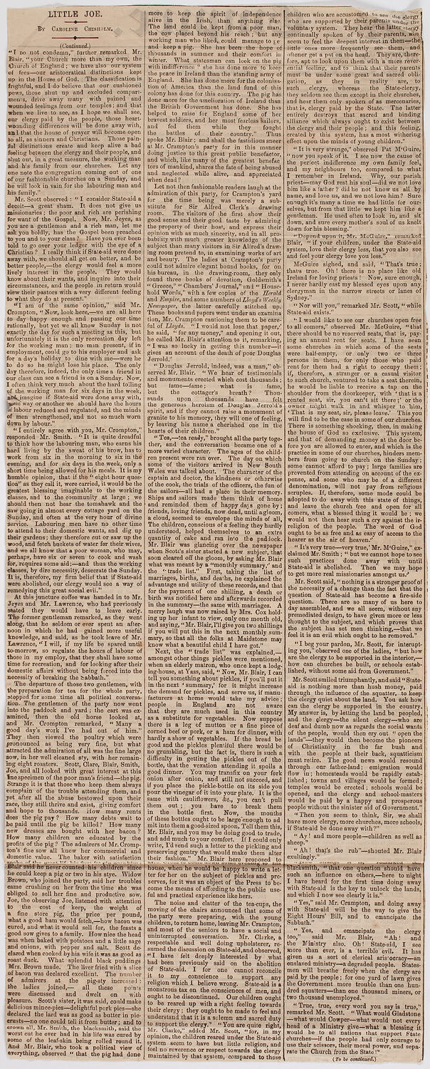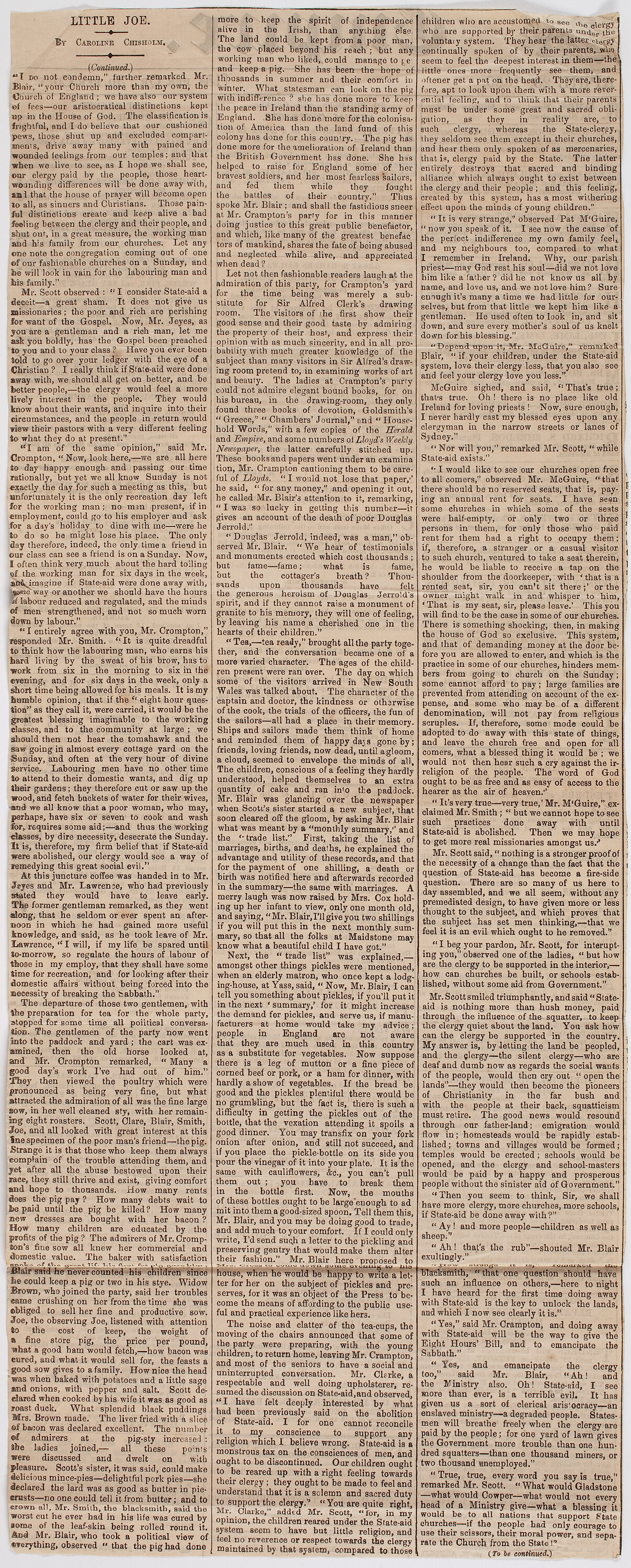 Loose newspaper clipping from scrapbook of newspapers and other flyers compiled by Caroline Chisholm, circa 1844-1861. The clipping is titled 'Little Joe', from The Empire, Sydney, 23 April 1860, and it was written by Caroline Chisholm.