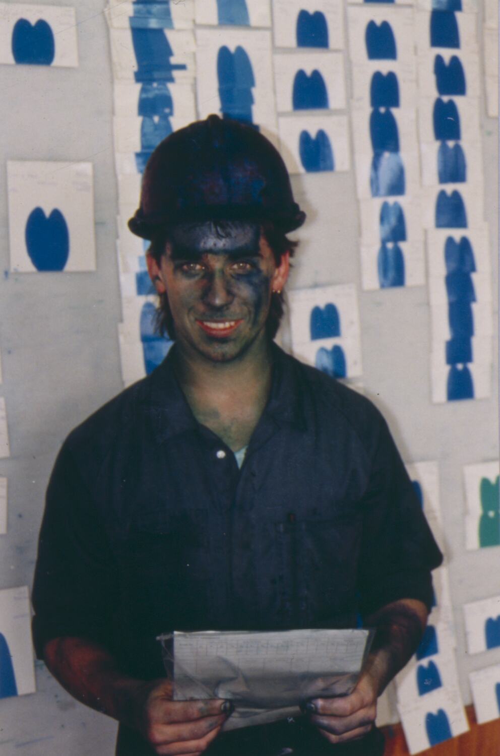 Colour image of a worker wearing a blue bolier suit and hard hat, holding a document in front of a wall of blue sample cards. The face, neck, forearms and hands of the worker show blue staining.