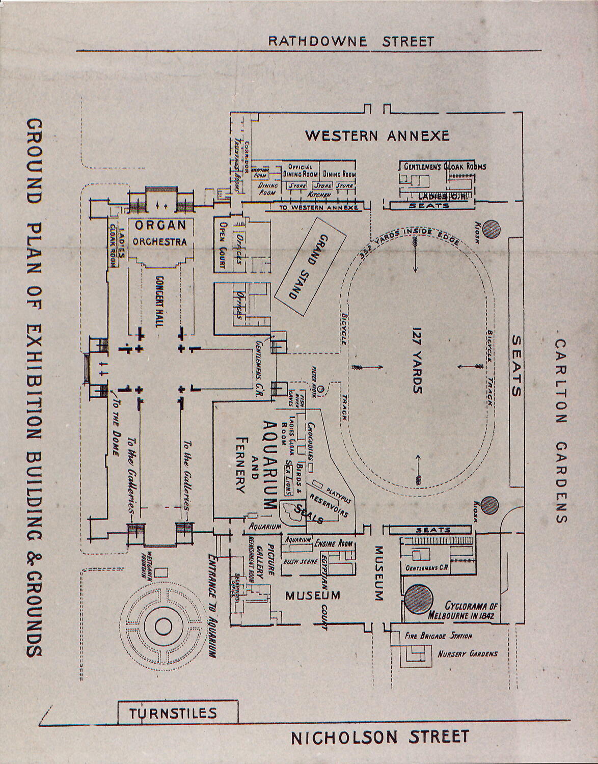 Photograph of a ground plan of the Exhibition Building and grounds from 1893. The plan shows the main hall (with the organ and concert hall), aquarium and fernery, museum (including the Egyptian court), cyclorama of early Melbourne, western annexe and oval (including the bicycle track and grandstand).