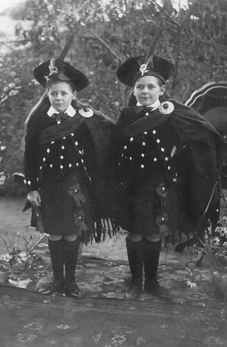 Black and white image of Lorna and Mavis McDonald wearing traditional Scottish Highland dancing costumes, circa 1917. Both of the complete costumes are held in the Museum Victoria collection.