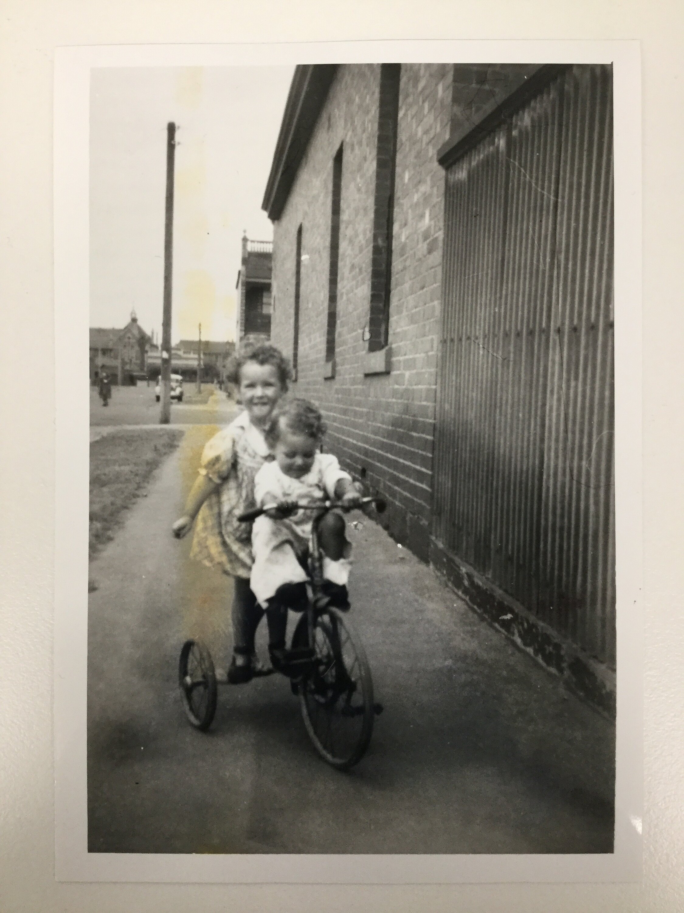 Black and white photograph of two young children, James and Kay Morgan riding a tricycle down a footpath in around 1943. Kay was born in April 1941 and James in September 1942. The photograph was recorded as being taken at the side of their home.