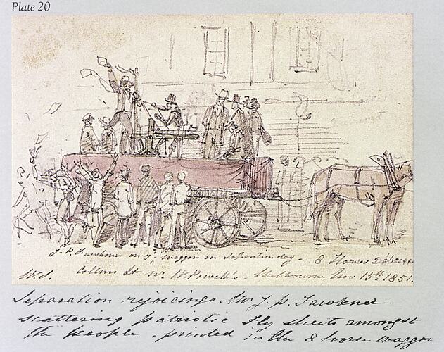 Black and white image of an illustration of Fawkner riding a cart with a printing press on top of it and printing off leaflets.