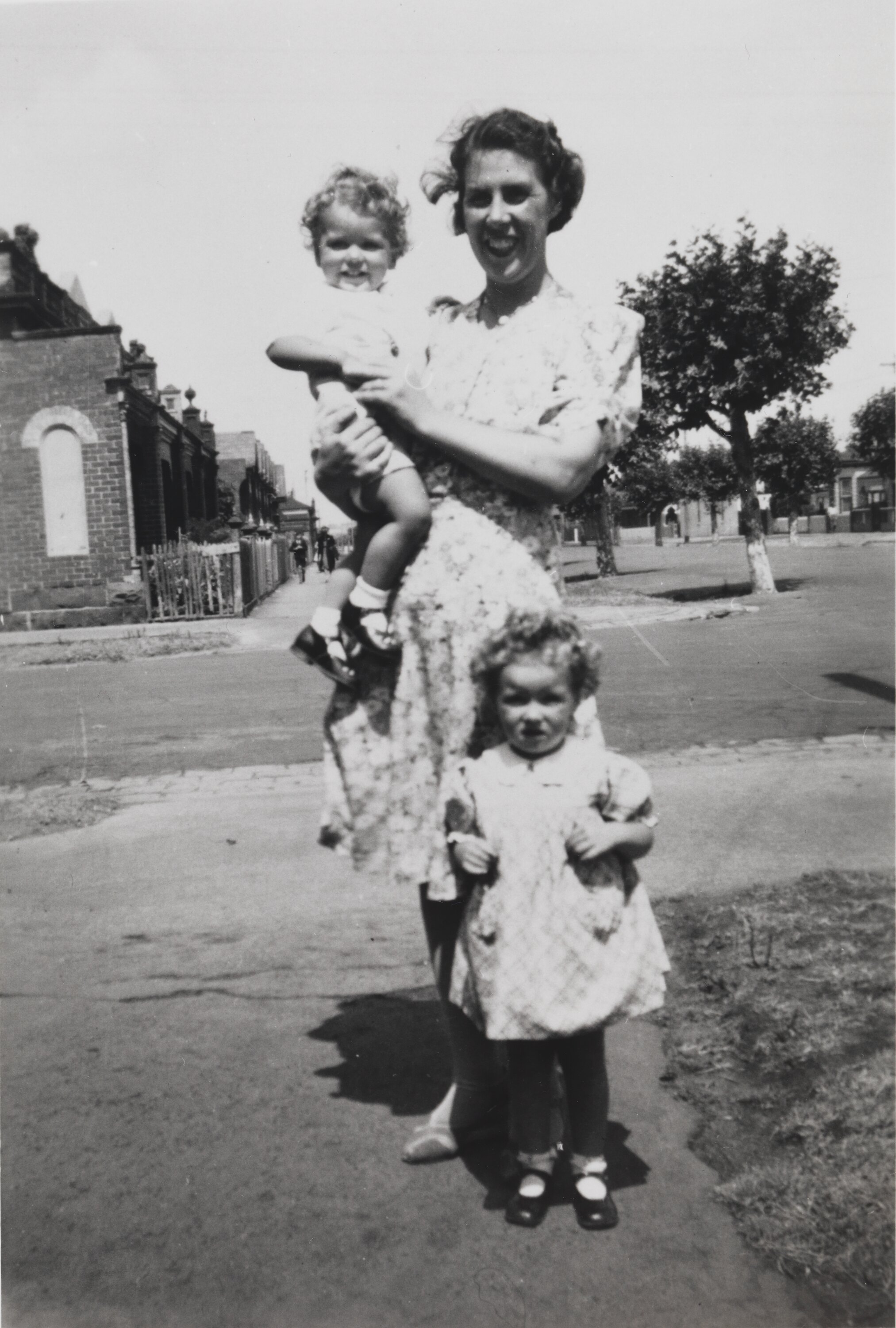 Black and white image of Mrs Morgan holding her young son, James, with her young daughter, Kay, by her side. Vi is standing outside her home, 105 Page Street, Albert Park, with the house on the opposite corner, number 107, visible.