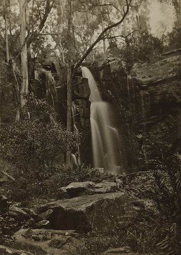 Black and white image of waterfall near Lorne, Victoria. It is part of a collection of glass plate negatives, stereoscopic negatives, panoramas, postcards, photographs and cameras belonging to the William S Anderson Collection.