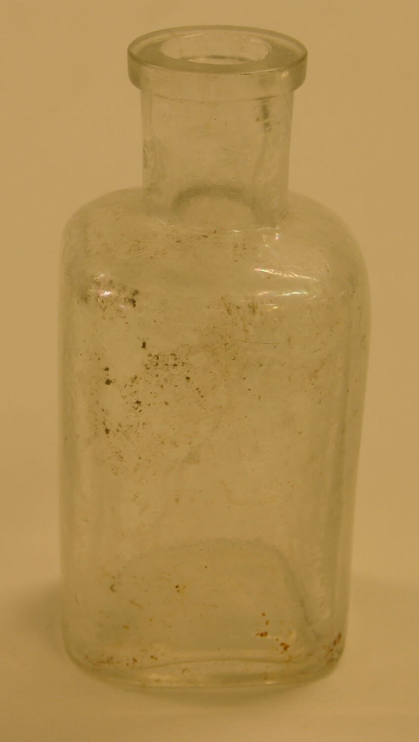 Clear glass bottle, probably used for medicine. Two piece vertical mould. Two part, flat top finish, flanged lip, cylindrical neck and sloped down shoulders. Square with rounded corners body horizontal, straight body vertical. Chamfered heel with flat re.