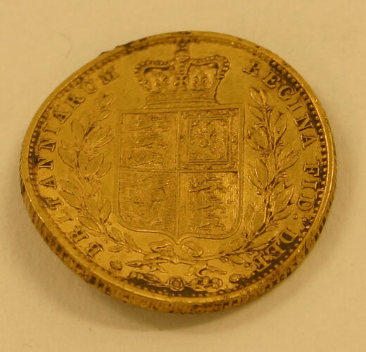 This coin was excavated at the Commonwealth Block site between 1988 and 2003. It is a British gold sovereign and minted in London in 1851. It is commonly called a Shield sovereign because of the shape of the Arms on the reverse. From 1872 the Melbourne Mint began to strike coins identical to this with the addition of a tiny 'M' Mint mark. Last Melbourne sovereigns made 1931.