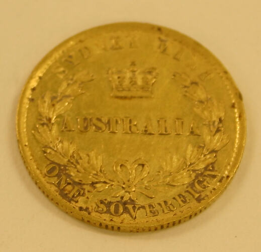 This is a gold sovereign from the Sydney mint. It is slightly bent but otherwise in good condition. On the obverse is the head of a young Queen Victoria and on the reverse there is a crown and a wreath.