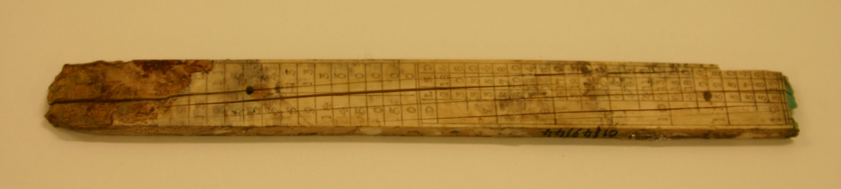Ivory slide rule. One side: narrow recessed strip in centre for slide, measurements in inches on raised section, either edge. Opposite side: figures (for distance calculations?) engraved on surface. Well-preserved - figures clearly visible. Found in sub-floor surface, 13 Casselden Place.