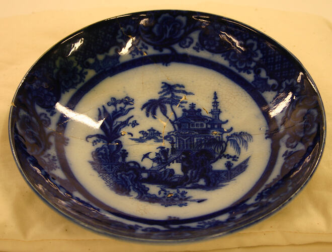 This saucer which has been reconstructed, is transfer printed blue flow ware with metal glaze. The design on upperside is a floral and geometric pattern and on the face it is scenic.