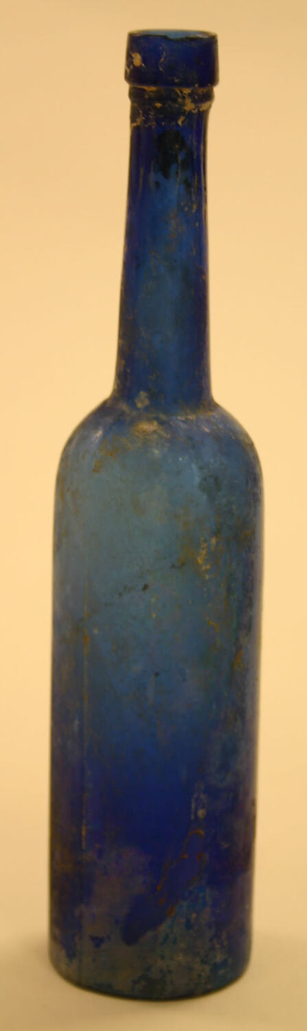 This is a cobalt blue cork closure bottle cork closure. It has a three piece finish with a down tooled lip and string rim. The neck tapers to rounded shoulders and a cylindrical body. It has a flat heel, shallow concave basal profile and no pontil scar.
