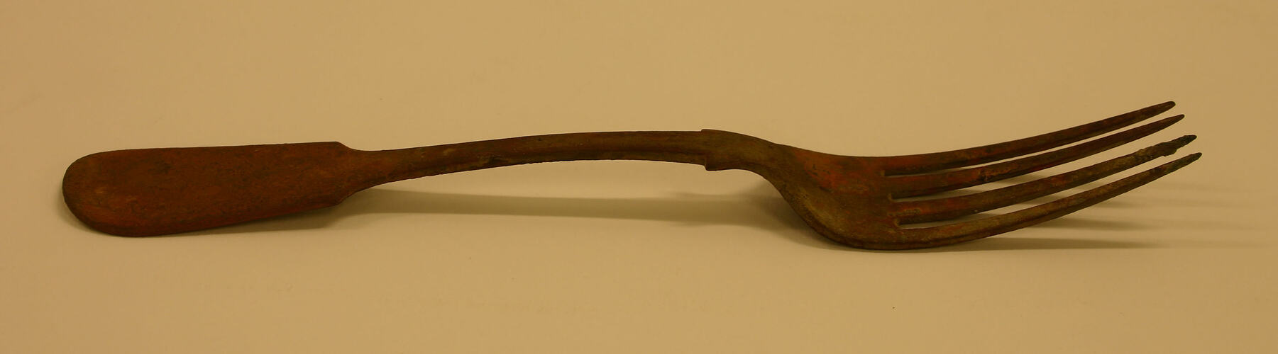 Large, 4-pronged metal fork. Length 270mm. Conservation reported, June 1999, that this tested positive for copper.