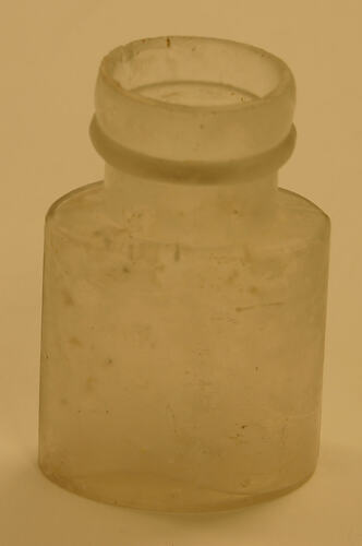This is a small clear glass bottle. It has a two part, flat finish and a cylindrical neck with a horizontal shoulder. The body is straight and ovoid. It has an abrupt heel with a flat resting point and an oval shaped shallow concave basal profile. The glass has become opalised.