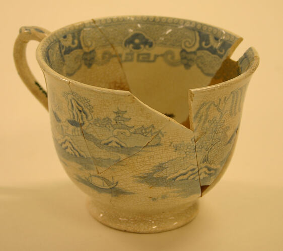16 fragments of 3 cups. 2 complete bases, rim, body and handle fragments. 2 cups with flared rims, edge, single loop handle. 1 fragment is from a different cup with indented body just above the base. Neutral glaze, with blue & white underglaze transfer printed design, floral/ geometric on inner rim and scenic on outside. Different fragment has same designs. 'Brosley' Pattern is pale 'Brosley'. possibly made by ?Spode of Staffordshire. many manufacturers - could be a pirate.