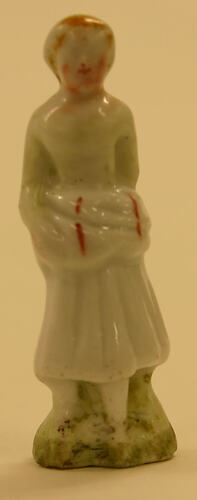 Figurine of young woman, painted slightly, moulded, pleated skirt, green grass up to skirt forming base. Yellow top, red and white scarf draped around waist, blond hair, hat, pink face, red lips. 4.7 high, 1.5 cm base diameter.