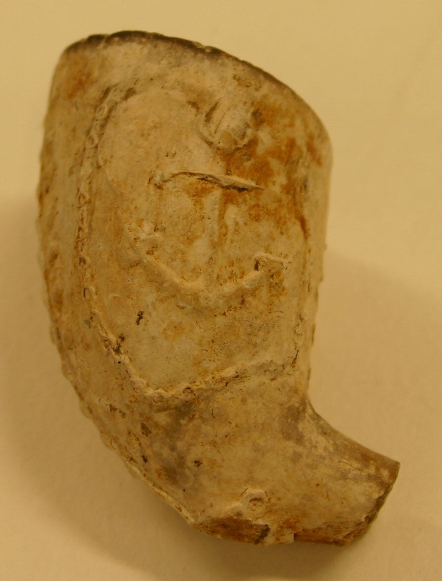 Fragment of tobacco pipe bowl. One side has anchor motif, the other three feathers crest - Prince of Wales motif. Dimensions 30mm x 20mm. Anchor motif includes some rope.
