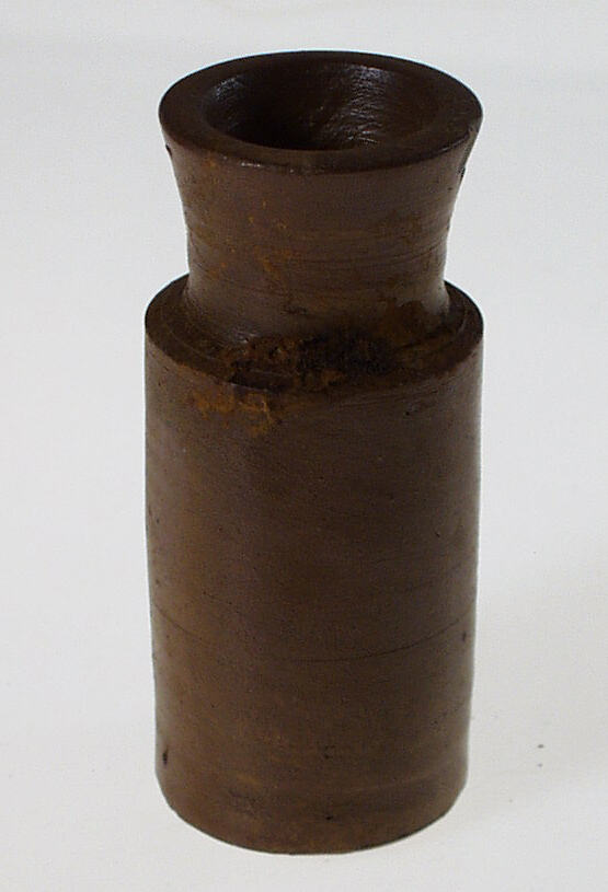 Pottery jar, flared rim, straight shoulder, cylindrical body, slightly concave basal profile. Salt glazed inside and outside. AS x 51, M-7.5YR 5/6 (Munsell colour). Wheel made (wheel striations visible). Base diameter 58mm, height 130mm. Probably for Black.