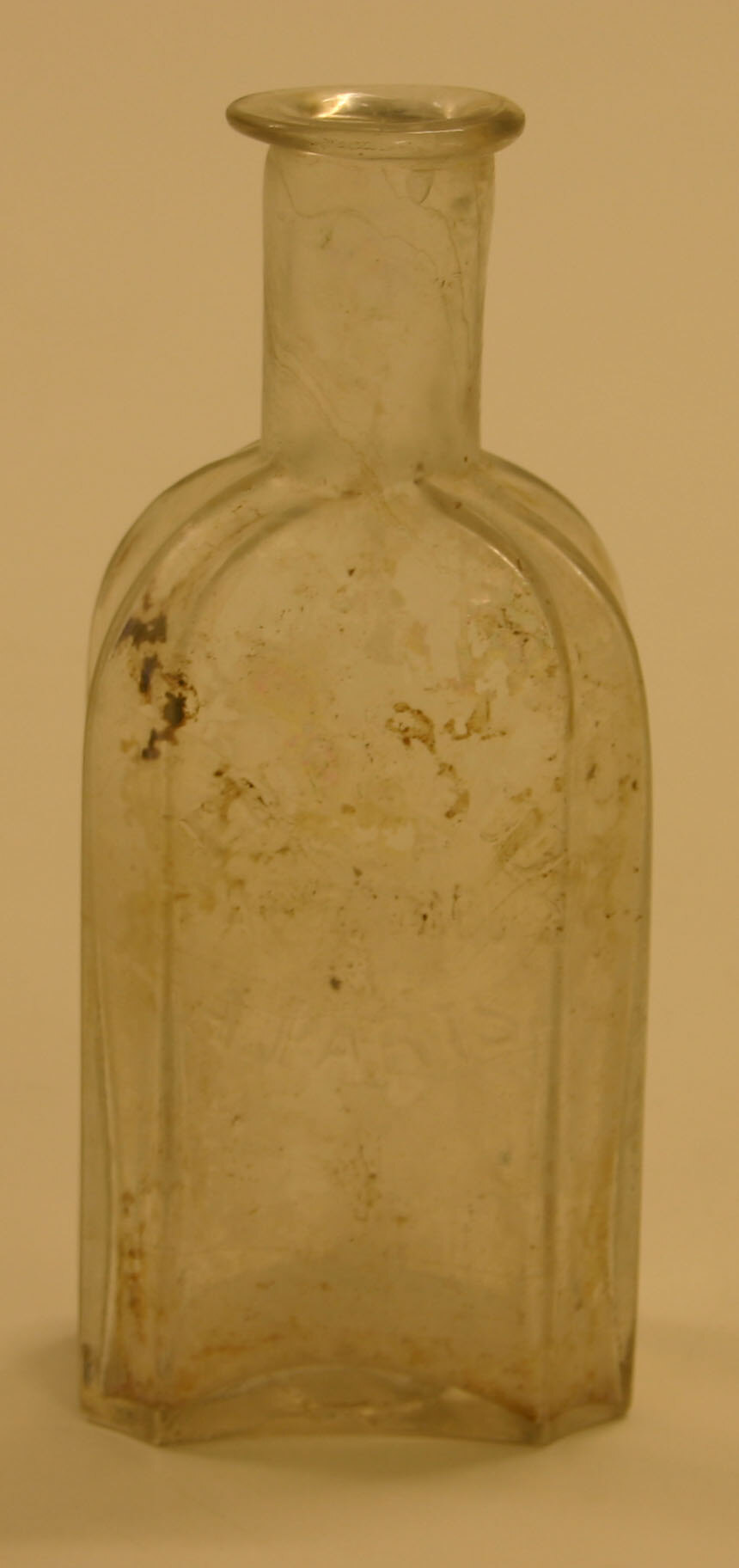 This is a clear glass bottle. It was possible made with a two piece vertical mould with separate base and it had stopper closure. It has a two-part finish with a flared lip and an applied cylindrical neck. It has a rectangular body with flat chamfers and a shallow concave basal profile. It has a pontil scar on the base and the glass is opalised. The bottle is decorated with lines running from the base of the neck to the base.
