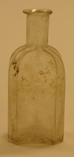 This clear glass bottle, used for perfume was excavated at the Commonwealth Block site between 1988 and 2003.
