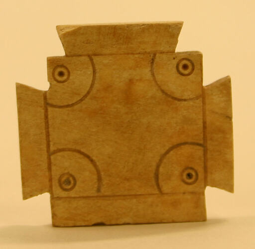 Unidentified, worked, wooden object with corners cut out. Each corner has a semi-circle and small circle and dot as a pattern. Could be unfinished. Dimensions 25mm x 25mm. Displayed in Australia Gallery as a gaming token.