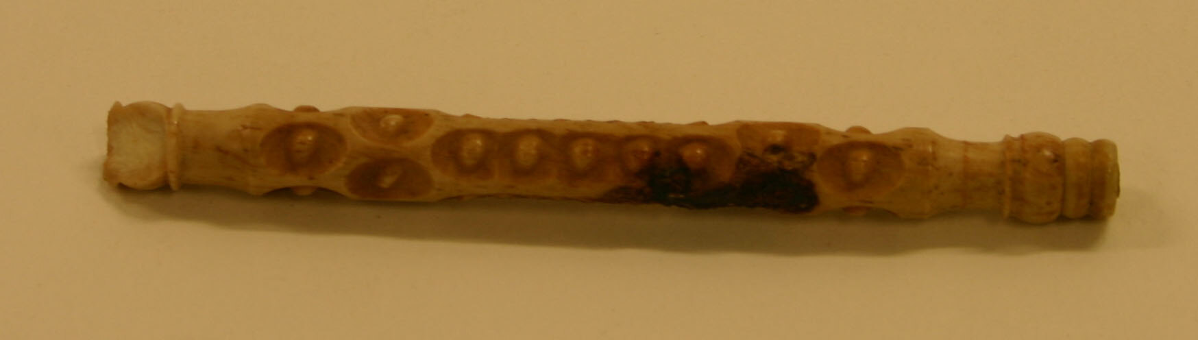 Bone lace-making tool. Broken in two pieces. One end screws off. Raised dot design over most of implement. 8.8 cm long, 6 mm diameter. This was originally thought to be ivory but was identified as bone by the Museum's Conservation Department in May 1999. Found in in-situ demolition; underfloor deposit.