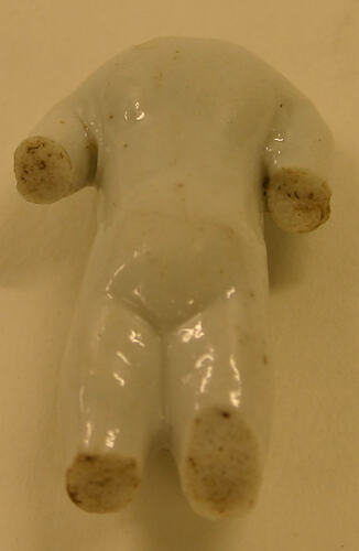 Frozen Charlottes were typically unjointed china dolls that ranged in height from 25 mm to 100 mm (the museum's example is 42mm). Originating in the USA, they were popular during the late 19th and early 20th centuries. The 25 mm (or 1") dolls were commonly known as 'penny dolls' as they sold for 1¢ in America.