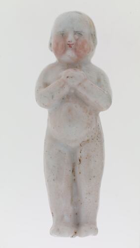 Frozen Charlottes were typically unjointed china dolls that ranged in height from 25 mm to 100 mm (the museum's example is 42mm). Originating in the USA, they were popular during the late 19th and early 20th centuries. The 25 mm (or 1") dolls were commonly known as 'penny dolls' as they sold for 1¢ in America.
