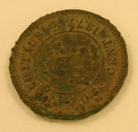 This is a 1 cent copper coin from Mauritius, it was excavated at the Commonwealth Block site between 1988 and 2003.