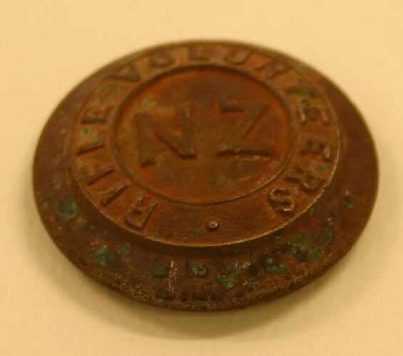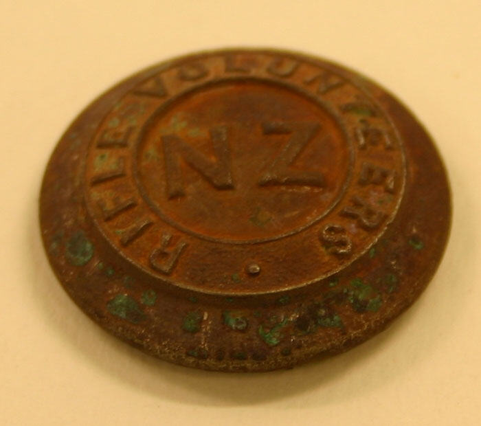 This brass military button was excavated at the Commonwealth Block site between 1988 and 2003. It was manufactured for Rifle Volunteers, NZ by Hobson and Son, of Haymarket, London.