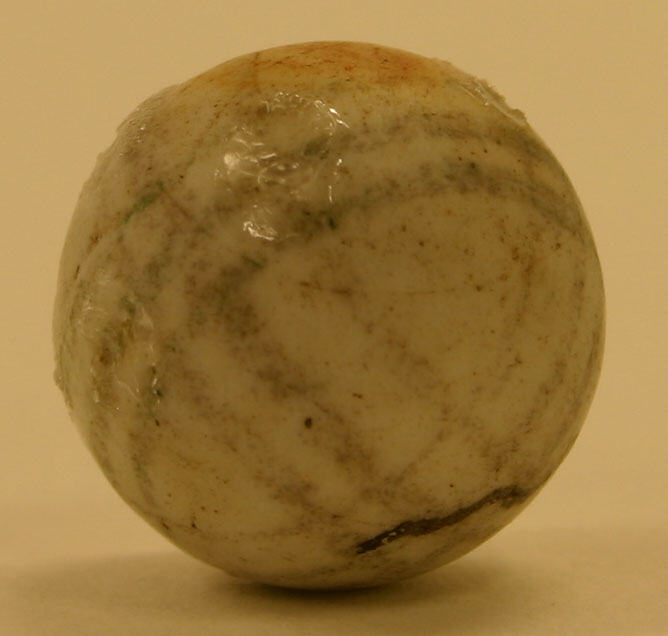 Ceramic marble with grey/green line patter made of white clay. Commonly known as a 'commie'.