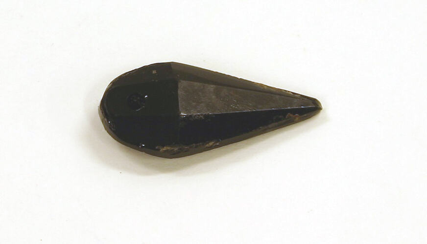 A teardrop shaped, black glass, jewellery drop.