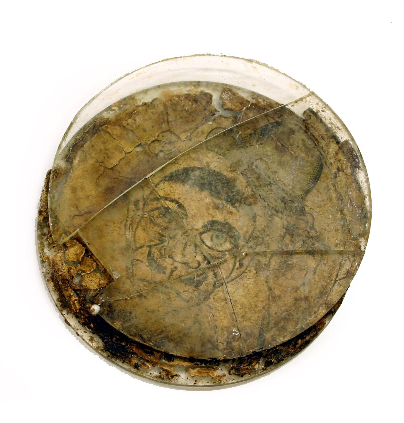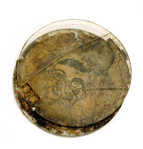 This object comprises of a disc of paper set between two small round pieces of glass of a similar size. The paper has a maker's mark on one side and the caricature of a Chinese man's face on the other.