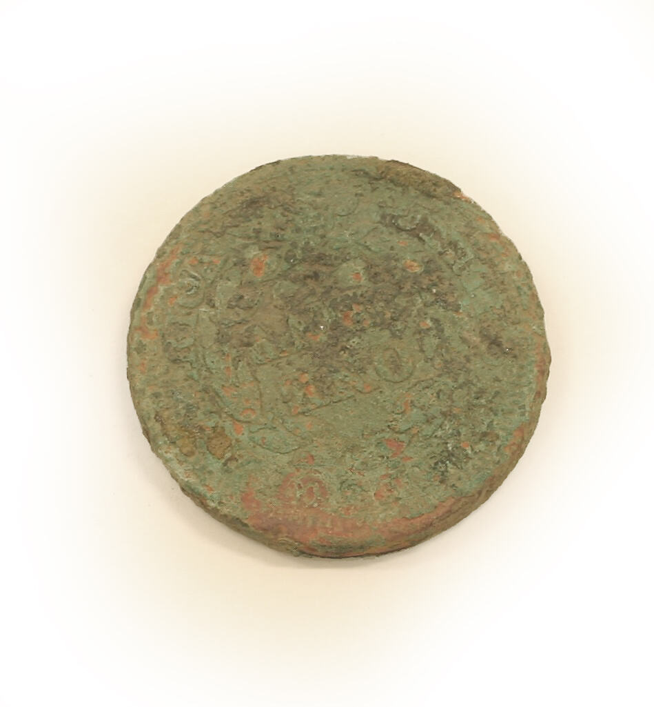 A coin manufactured in the United States of America between 1840 and 1857. It is encrusted and the impression can not be read.