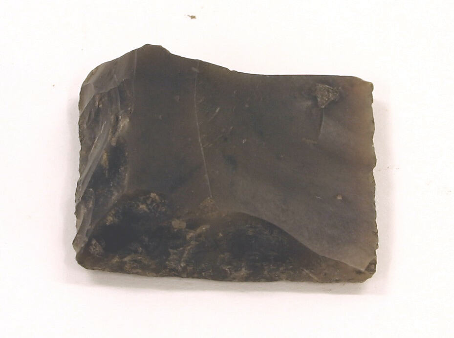 This is a small piece of dark flint that was made to be used in a gun, however it does not appear to have been used.