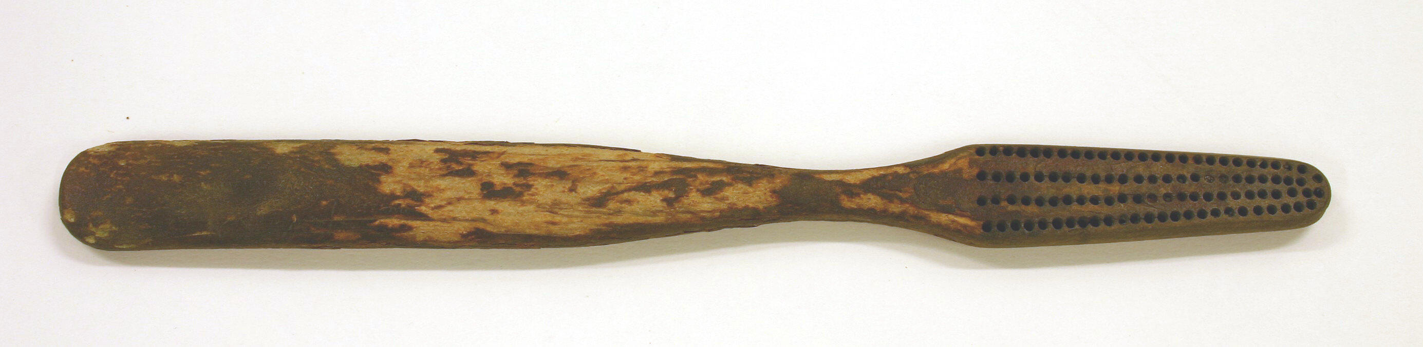 This long flat carved bone toothbrush, has an angulated head with holes in it for bristles, which have not survived.