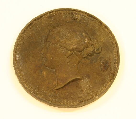 This commemorative medal was excavated at Casselden Place in 2003. It was made in 1853 to commemorate both the cessation of transportation in Tasmania and the Jubilee of the foundation of the Colony of Tasmania (Van Diemen's Land). They were given to people who had served on anti-transportation committees. Only 100 of these bronze medals were made for the Tasmanian committee. There were 9000 struck in white metal and 1 in gold at the Royal Mint in London. For this reason they were distributed in c.1855, 2 years after transportation officially ended.