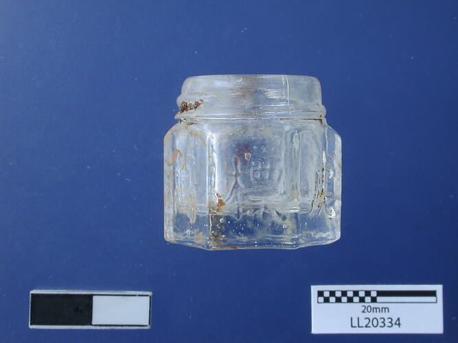 A glass hexagonal pot that was used for tiger balm. It was manufactured in China and has a maker's mark.