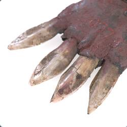 Aboriginal people in central Australia produced a variety of body ornaments for ceremonial and decorative purposes. Headbands, armlets, aprons, pubic tassels, pendants, neckbands and other ornaments were made from materials such as human-hair string, feathers, animal bones and spinifex resin. This item was generally worn by woman as a headband with the pendant placed over the forehead. In some cases, these ornaments were 'sung' to give them certain magical powers and were traded between neighbouring groups.