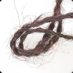 An ornament made of human hair string with kangaroo incisors embedded in resin.