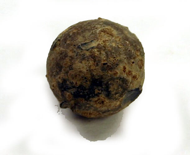 A small spherical piece of lead. It is slightly rusted.