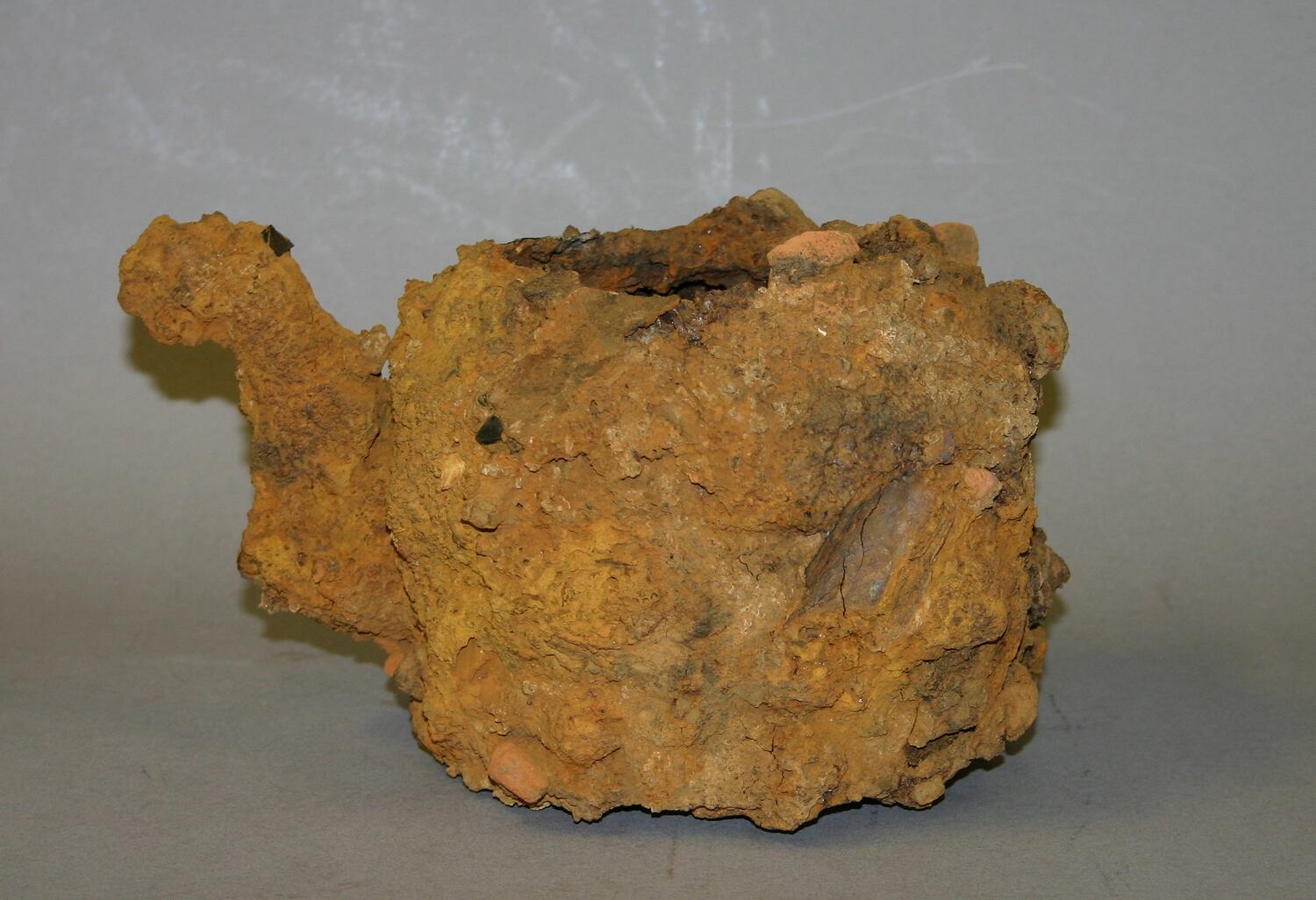 This is a large domestic iron alloy kettle, which has been damaged by rust. The handle is missing, but the spout is still present.