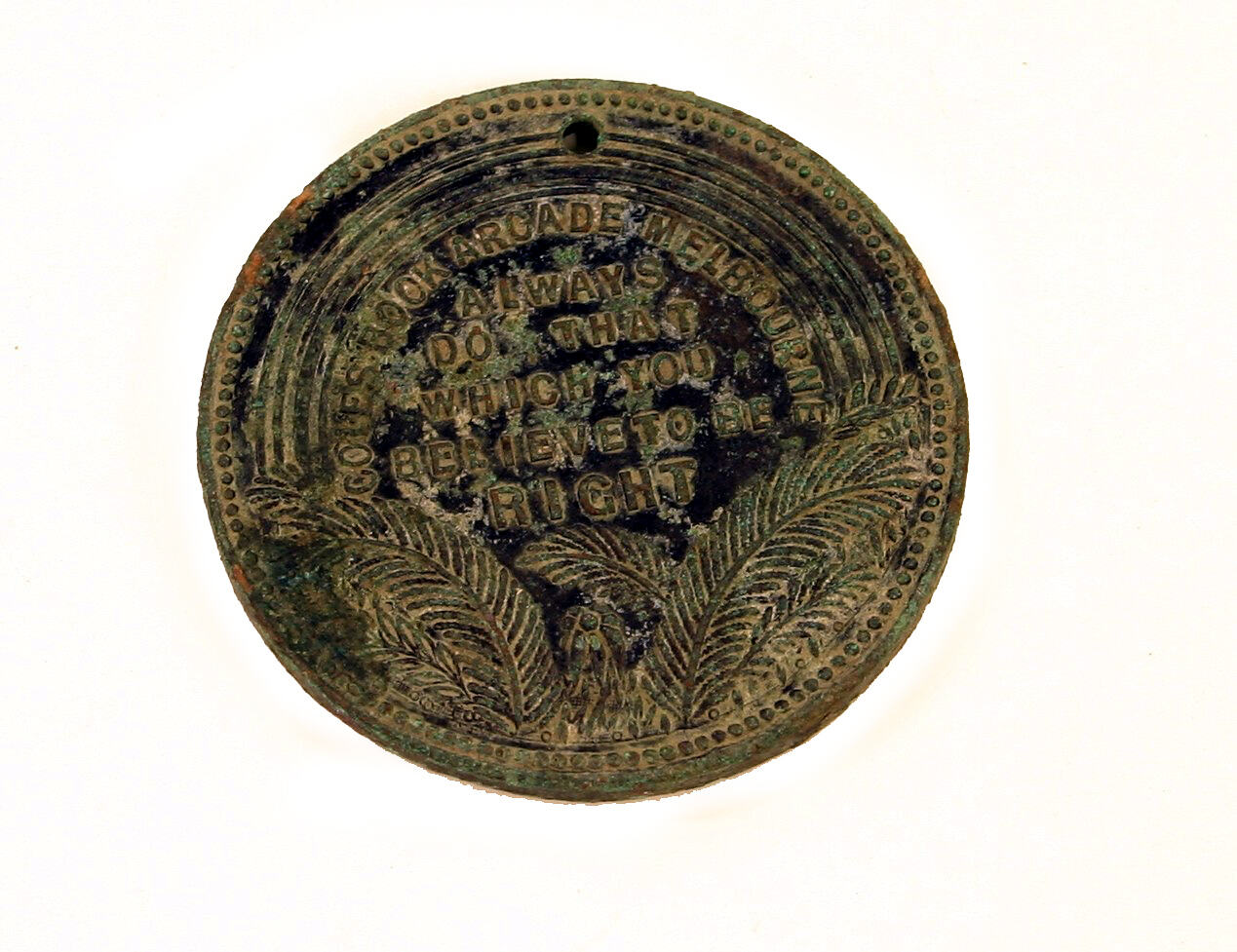 Copper alloy medal minted in Melbourne in the late 19th century, inscribed 'COLES BOOK ARCADE MELBOURNE' and ALWAYS DO THAT WHICH YOU BELIEVE TO BE RIGHT'. This was one of a series of medals offering maxims and proverbs issued by E.W. Cole at his Book Arcade. He called the medals 'little missionaries for the spread of educative knowledge' (Dean, 1988, p.36).