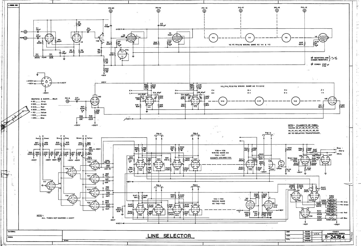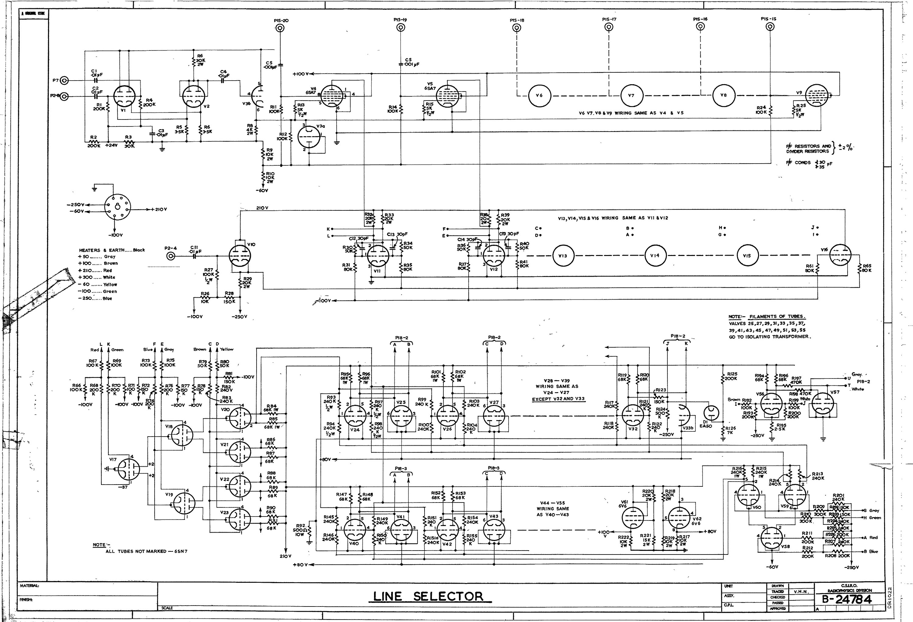 A schematic diagram shows the detailed connections between all the components in a circuit. Such diagrams were used to build circuits and later for testing. For CSIRAC, the most common components were vacuum tubes (valves), capacitors and resistors. Schematic diagrams are also known as circuit diagrams.